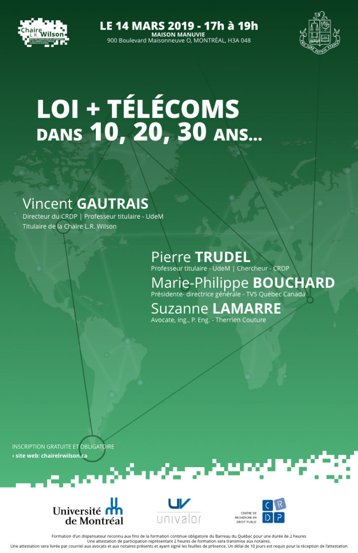 Activités de la Chaire L.R. Wilson Pierre Trudel, Marie-Philippe Bouchard, Suxanne Lamarre, Loi + Télécoms dans 10, 20, 30 ans…(14 mars 2019)14 mars 2019 Affaires électroniques